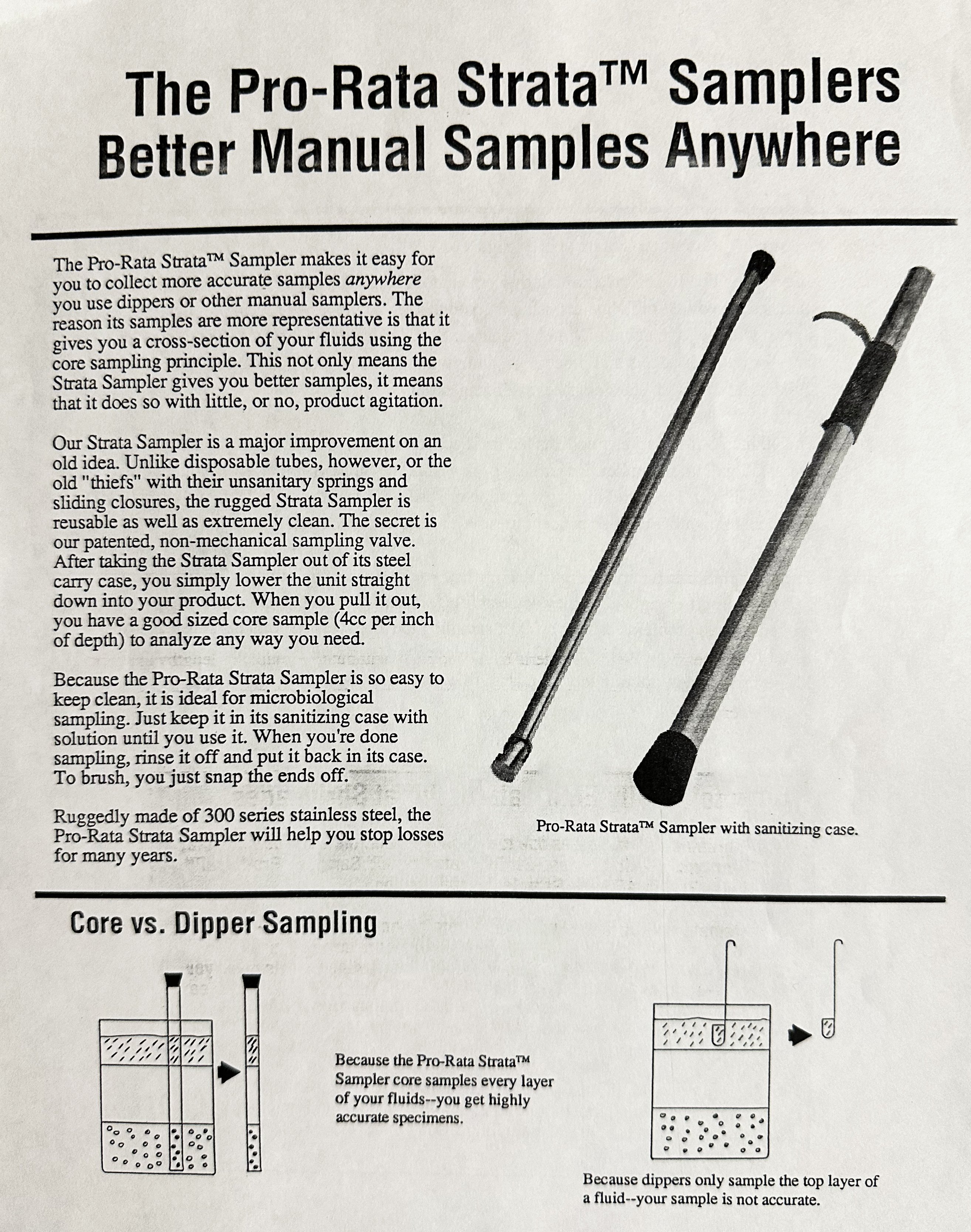 The stainless steel Pro-Rata Strata Sampler makes it easy for you to collect more accurate samples anywhere you use dippers or other manual samplers. Proven “core” sampling design allows it to deliver better samples with little or no product agitation. Sanitary construction meets the criteria for use under the Grade A Pasteurized Milk Ordinance of the U.S. Food and Drug Administration. Available in 30″ length for taking accurate samples of raw milk in bulk tanks, 40″ length for sampling larger bulk tanks and 55 gallon drums, and 60″ length for sampling transports before pump-off. All models include sanitary solution case for carrying and brushes. Sample volume 4 ml per inch of length.